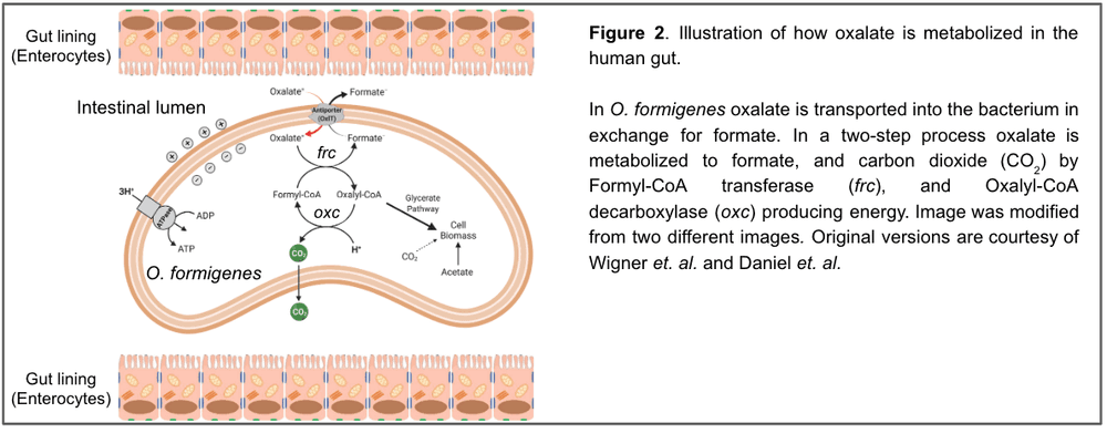 So how are oxalates broken down in our body? One of the main specialists you need to know is Oxalobacter formigenes, or O. formigenes, a bacteria that requires oxygen-free conditions (i.e., it’s an anaerobe) that lives in your gut. As illustrated in Figure 2 (upper right), O. formigenes use oxalates to extract energy for growth. Employing a two-step process that uses catalysts to bring about a specific biochemical reaction (i.e., enzymes called formyl-CoA transferase (frc), and oxalyl-CoA decarboxylase (oxc), they degrade oxalates to produce carbon dioxide and formate that can be consumed by other microbes in the gut. A lower prevalence of O. formigenes has been associated with increased urinary oxalate excretion and the development of kidney stones.[8] [9] [10] There are hundreds of species, including lactic acid-producing bacteria (LAB), that possess oxc and frc enzymes required to break-down oxalates.[11] [12] This functional characteristic of breaking down oxalates is captured in the Oxalate Metabolism Pathways score to better assess your gut’s oxalate biochemistry, as described in our scores blog.