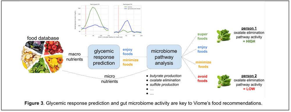 Viome’s Nutrition 2.0 platform is a strategy to leverage your specific biochemical functionality and tailor food and supplement recommendations that meet your needs. Viome’s wellness tests and App provide comprehensive food and supplementation recommendations based on your gut microbiome activities. As introduced in our previous blog about the journey of your sample, and illustrated in Figure 3, Viome’s Glycemic Response Model first predicts whether a food, in this case spinach, is ‘enjoy’ or ‘minimize’ based on macronutrients curated in Viome’s food database and your gut microbiome. Combined with your health scores, by analyzing the biochemical pathways, spinach is further categorized into ‘superfood’ if your Viome App Oxalate Metabolism Pathways score is high (‘good’), and ‘avoid’ if it is low (‘not optimal’).