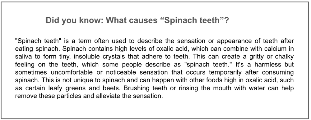 Turns out it specifically has to do with oxalates and how much capacity your body, specifically your gut microbiome, has to break down and use (i.e., metabolize) them. Oxalates are organic salts naturally present in many vegetables, fruits, nuts, and other plant foods. In plants oxalates serve beneficial roles in defense from insects, heavy metal detoxification, and pH regulation.[1] Spinach is one of the highest-oxalate-containing foods, as are some other leafy greens like beet greens, purslane, rhubarb, chard, endive, and dandelion greens. Our body can also produce oxalates internally (endogenously) by breaking down proteins (amino acid metabolism).[2] [3] If the body cannot metabolize oxalates efficiently, high levels of oxalates in urine can lead to the development of kidney stones! It has been reported that close to 80% of all kidney stones are formed from calcium oxalate (CaOx).[4] [5] This binding to calcium in the gut can also inhibit calcium absorption by the host, which is undesirable.[6] [7]