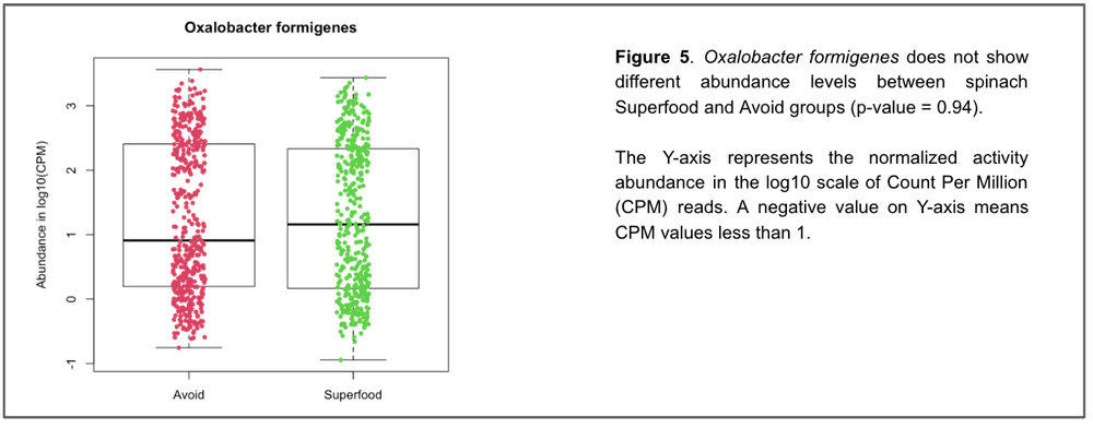 - The abundance of the “oxalate specialist” O. formigenes activity is not different in customers who were recommended spinach as a ‘Superfood’ compared to a recommendation of Avoid.