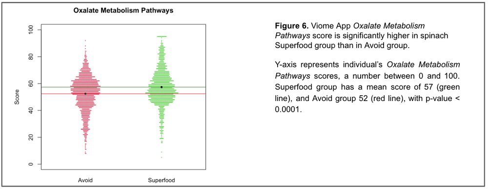 - Oxalate Metabolism Pathways score is shown to be significantly higher (‘good’ direction) in customers who were recommended spinach as a ‘Superfood’ compared to a recommendation of ‘Avoid’.